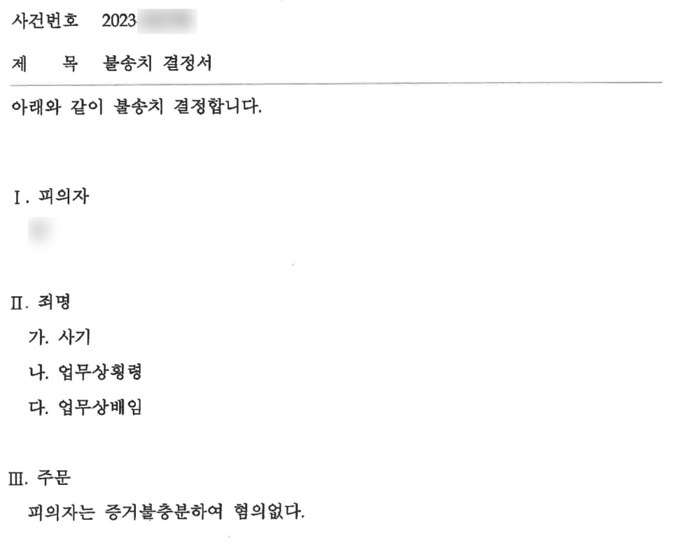 → 불송치결정서에도 고소인의 일방적 주장만으로 범죄를 단정할 수 없다는 판단이 기재되었습니다.