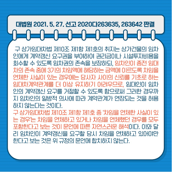 따라서 임대인은 임차인의 계약갱신 요구를 거절할 수 있다. 이 판례는 임대인의 입장에서 매우 중요한 의미를 갖습니다. 임대인은 과거의 연체를 명확히 증명하기만 하면 법적으로 정당한 절차에 따라 갱신 거절을 할 수 있기 때문입니다.