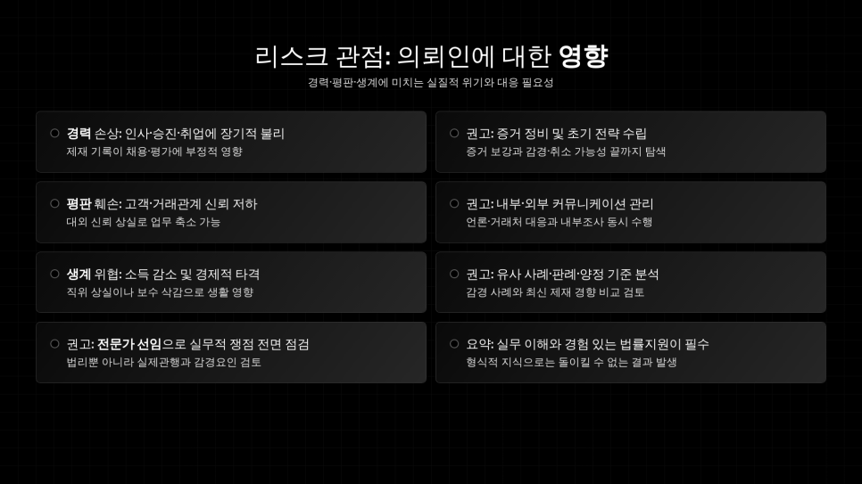 금감원 제재는 인생에서 한 번 겪을까 말까 한 중대한 위기입니다. 그 결과는 향후 경력, 평판, 생계에까지 중대한 영향을 미칠 수 있습니다.