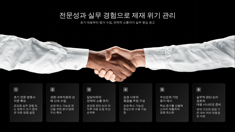이 질문들은 단순한 법률 해석만으로는 답하기 어렵습니다. 실제로는 금감원 내부에서 어떤 기준으로 판단하고, 어떤 논리 구조로 감경 여부를 정리하는지를 알아야 합니다.