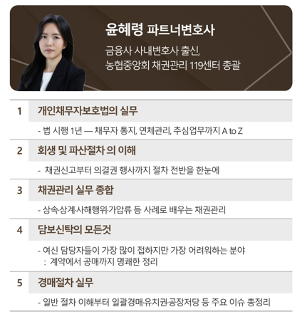이에 법무법인 호암의 윤혜령 파트너 변호사는 최근 여러 지역 농협을 직접 방문하여, 실무 담당자들을 대상으로 개인채무자보호법의 핵심 내용과 실무 적용 방안을 주제로 한 순회강의를 진행했습니다.