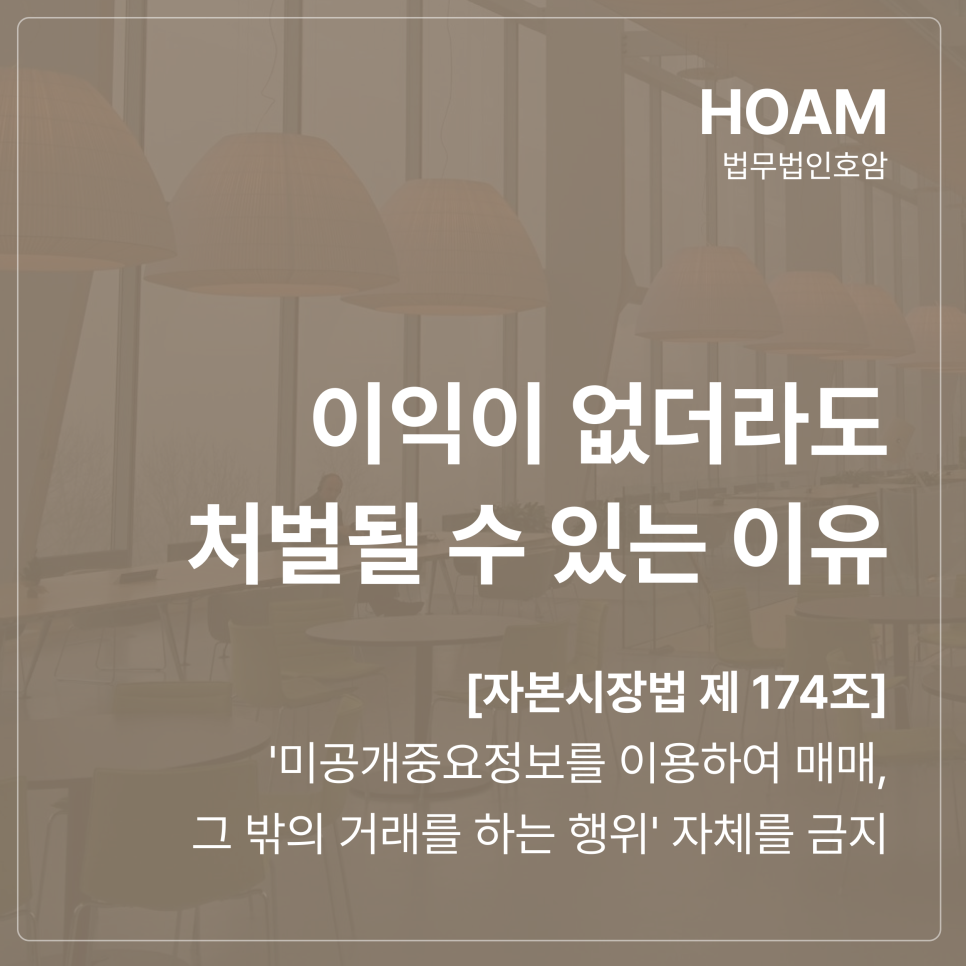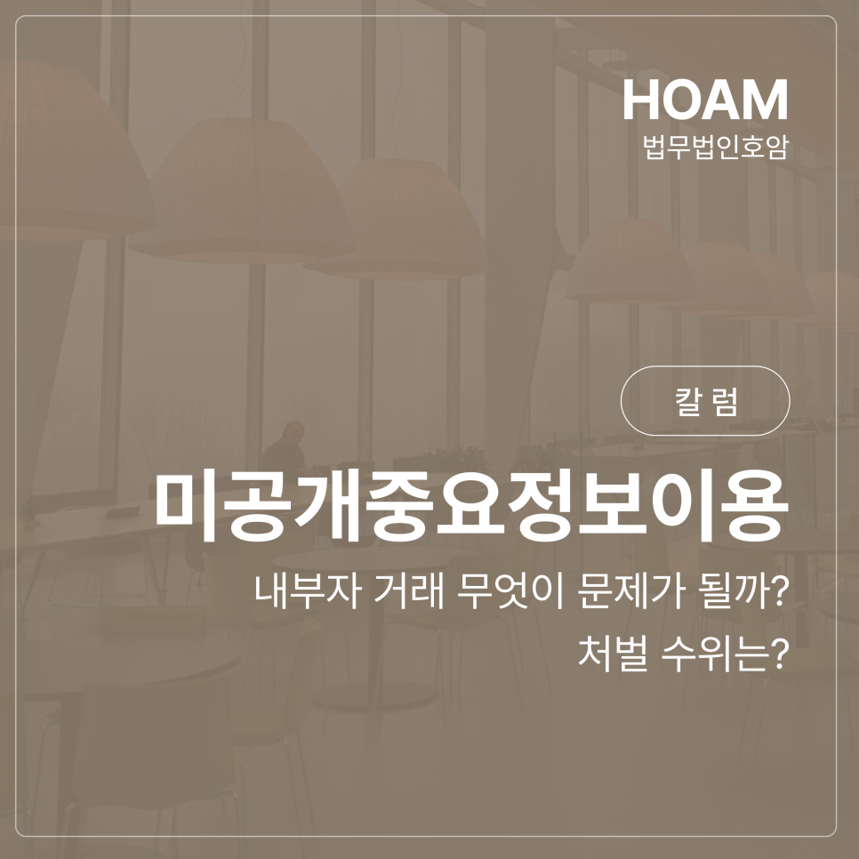 과거에는 이른바 작전 세력이라 불리는 이들이 주 타깃이었다면, 최근에는 재직 중인 회사의 업무 과정에서 혹은 거래처와의 협업 과정에서 취득한 정보를 이용한 미공개중요정보 이용행위(내부자거래) 혐의로 법무법인 호암 금융전담센터를 찾는 분들이 급증하고 있습니다.