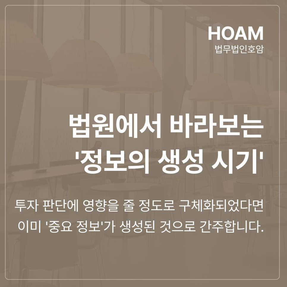 합리적인 투자자의 입장에서 보았을 때 해당 정보가 시장에 미칠 중대성과 그 사실이 실제로 발생할 개연성을 비교 평가하여, 투자 판단에 영향을 줄 정도로 구체화되었다면 이미 중요 정보가 생성된 것으로 간주합니다.